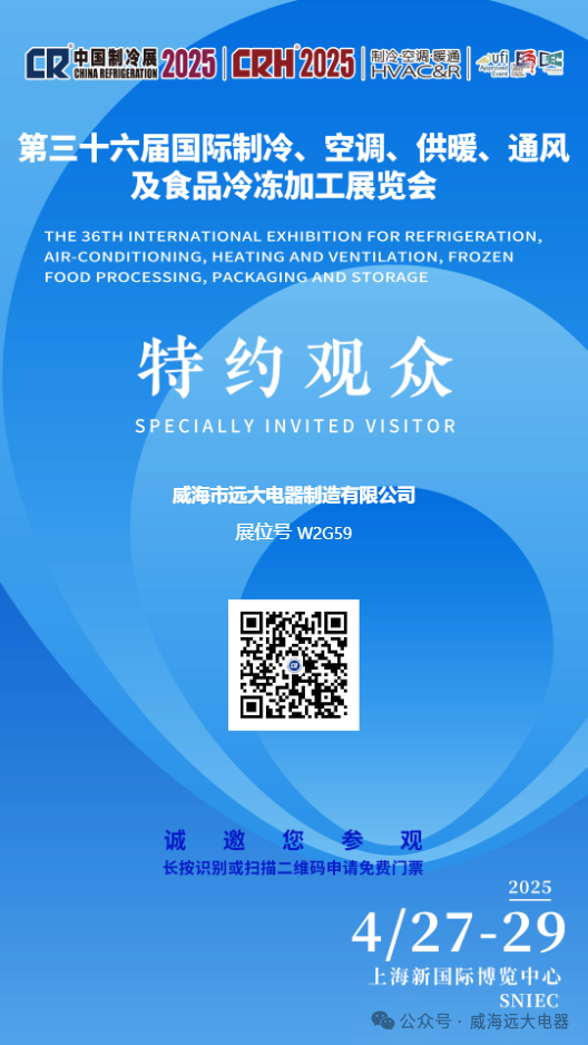 您好!非常感謝您長(zhǎng)期以來(lái)對(duì)威海遠(yuǎn)大電器的大力支持,第三十六屆中國(guó)制冷展即將亮相上海,屆時(shí)我們展會(huì)現(xiàn)場(chǎng)將會(huì)進(jìn)行我司產(chǎn)品陳列展示,在此,我們誠(chéng)摯的邀請(qǐng)您蒞臨我司展位參觀指導(dǎo),我們將會(huì)為您提供貼心、專業(yè)的產(chǎn)品與技術(shù)服務(wù)。