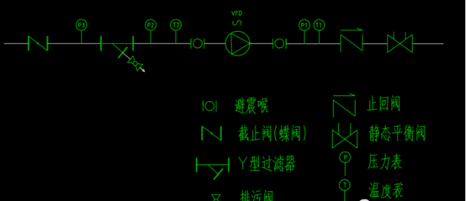 避震喉→壓力表P1→溫度表T1→止回閥→靜態(tài)平衡閥